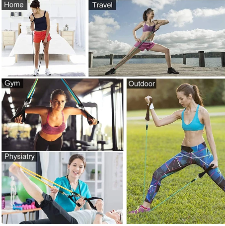 Descripción Especificación11 SET: 5 cuerdas de tracción, 2 asas, 2 cinturones de tobillo, 1 ancla de puerta y 1 bolsa de telaCuerda de tracción (máximo de Libras negras): cuerda de tracción (máximo de Libras rojas):Amarillo: 10lbs Amarillo: 10lbsRojo: 20lbs Azul: 20lbsAzul: 30lbs Negro: 30lbsColor verde: 40LBS Color verde: 40LBSNegro: 50 libras Total 150 libras Rojo: 50 libras