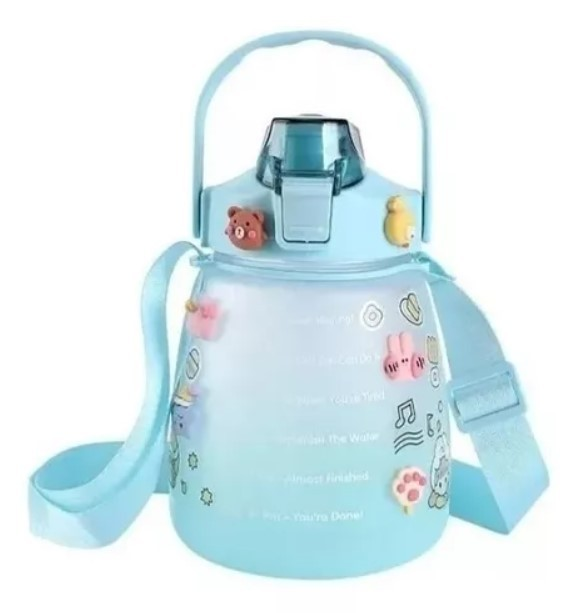 COLORES AL AZARDivertida botella motivacional para beber agua, cumple tu meta diaria y haz que el reto sea más divertido.Incluye:-1 Botella color a elegir (azul, rosa, morado, meta)-1 correa para fácil transportación-1 planilla de calcomanías decorativas-4 stickers decorativos 3DCapacidad: 1300 mlLista del paquete:Botella de agua x1Cuerda x1bombilla x1stikers x4Pines x4COLORES AL AZAR
